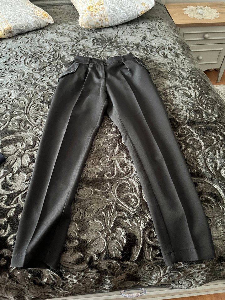 siyah renkli, kemerli, midi boy ve regular fit kesime sahip kadın kumaş pantolon. Ofis stiline uygun klasik tasarım sunar.
