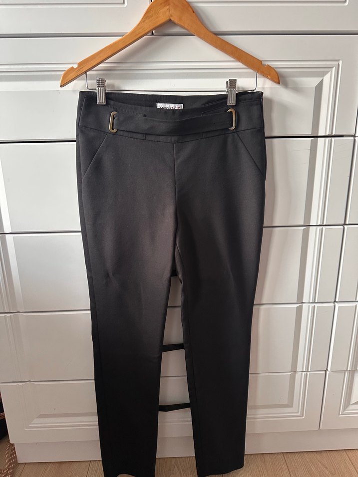Kemerli, siyah renkte, ofis stiline uygun kadın kumaş pantolon, midi boy ve yumuşak kumaştan. 36 bedene uygun kusursuz