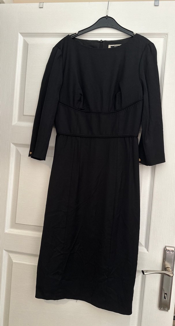 Kemer detaylı, fakir kol siyah gece elbisesi. Ofis ortamına uygun, klasik ve gotik tarzda, desen içermeyen tasarım. Bele oturan kalem elbise