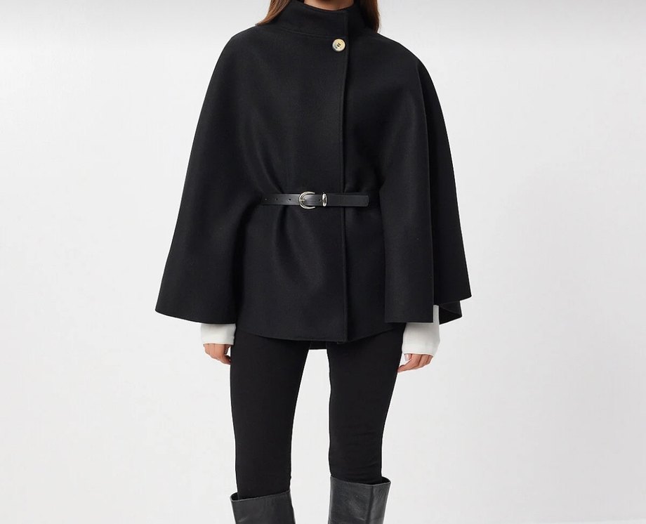 Yüksek yakalı, uzun kollu ve bol kesimli siyah kadın panço. Kemerli bel detayı ve sade koyu renk tasarımıyla ofis için trend bir tercih. kemeri kahverengi hiç kullanmadım yeni hiçbir soruju yok tesettür içinde uygun kısa değil