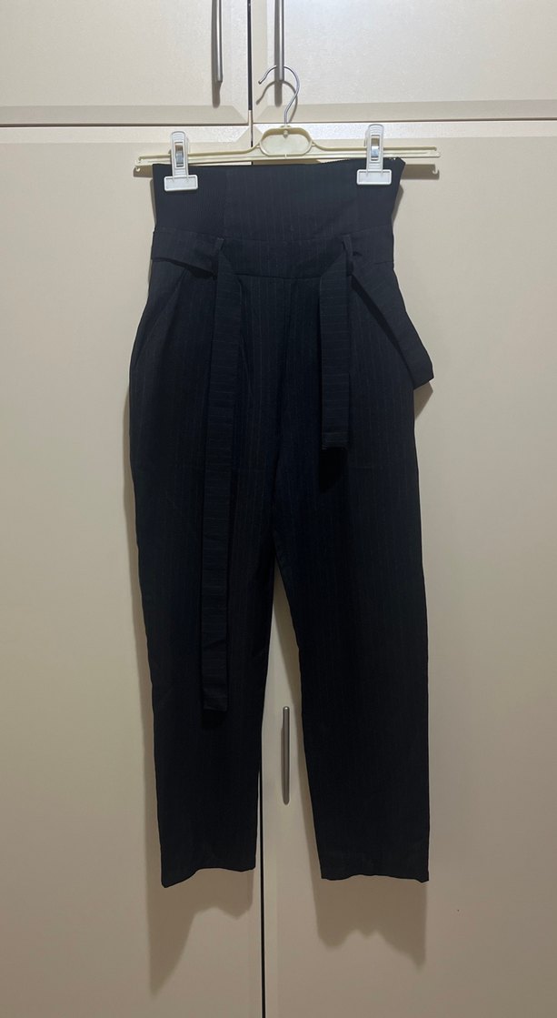 Kemerli ve lastikli bel ve normal kesime sahip siyah kadın pantolon, yüksek bel ve çizgili