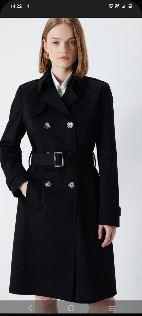 Kemerli, sivri yaka detaylı siyah kadın trençkotu. Orta boy, düzenli kesim ve askılı kollara sahip, ofis için uygun sentetik kumaştan.38 bedene de olur