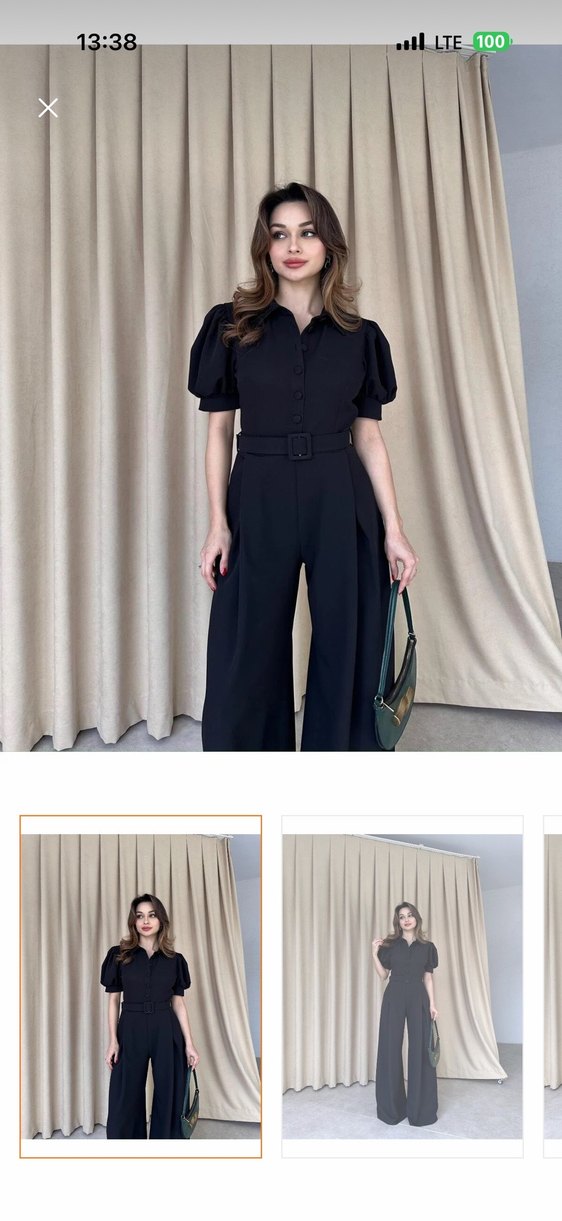 Kemerli, V yaka ve kısa balon kollu siyah kadın tulum. Ofis için uygun, rahat kesim ve uzun boy. Yumuşak sentetik kumaştan.