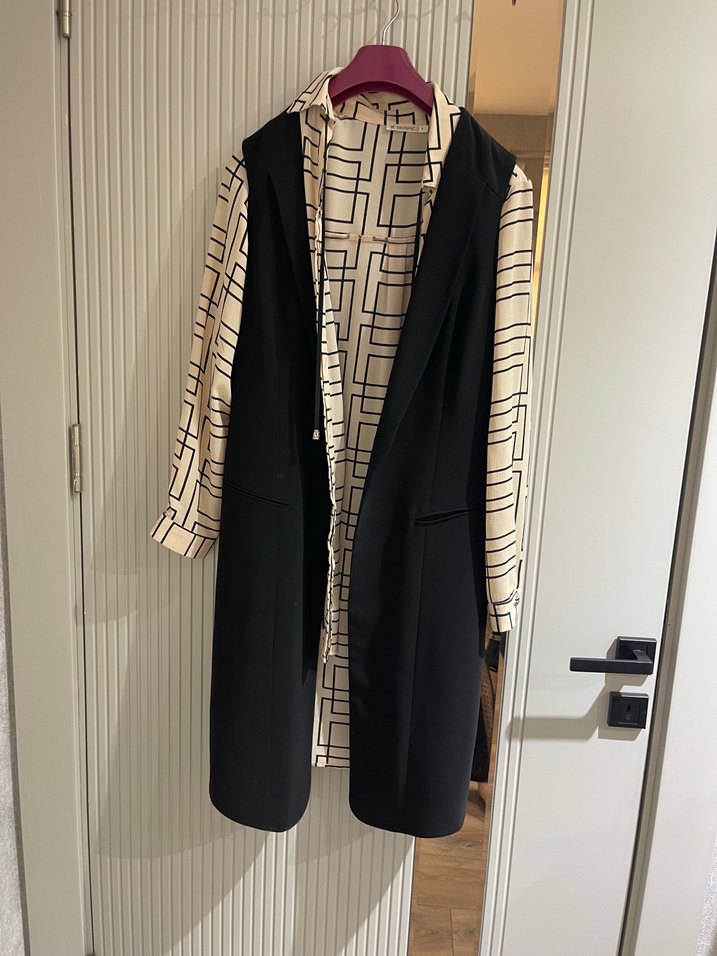 Kemerli bel, çıtmalı yakalı ve sentetik kumaştan yapılmış uzun siyah kadın yeleği, ofis için modern bir tarz sunar.