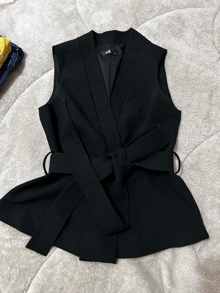 Kemerli, yakalı, kolsuz siyah yelek. İpek dokulu kumaştan, normal kesim ve midi boyda, ofis kullanımı için uygun.