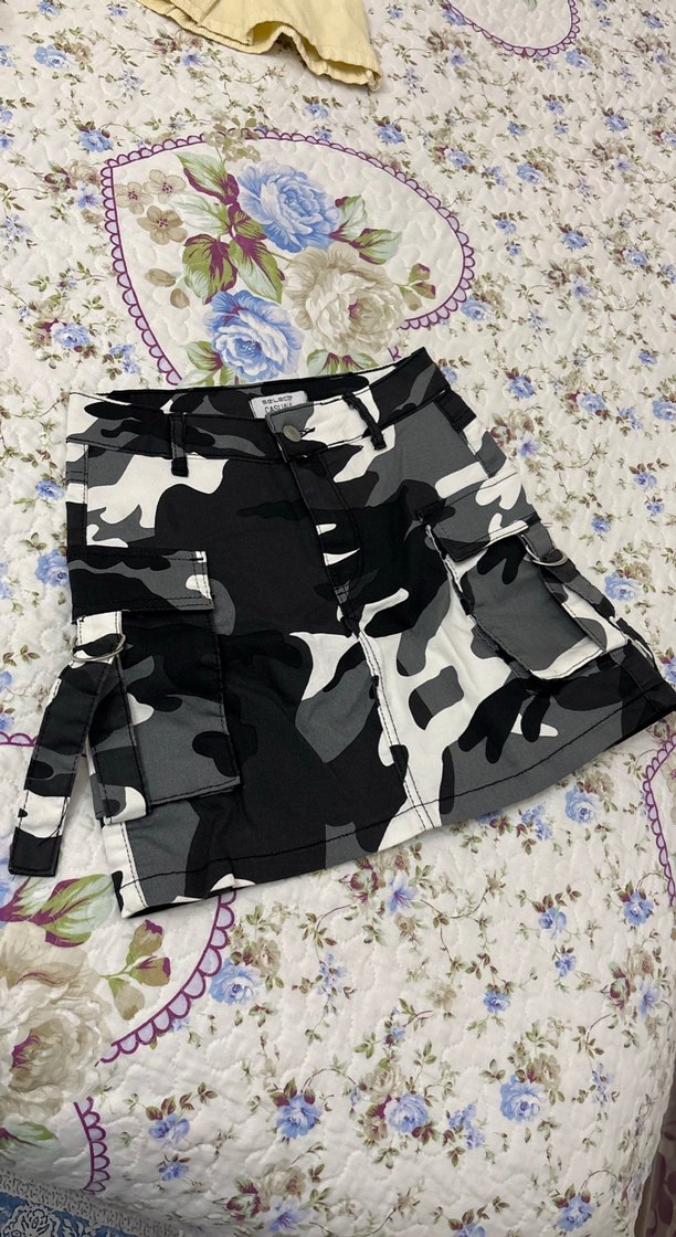 Kemerli, bol kesim, siyah kamuflaj desenli sentetik kumaştan mini etek. Sokak stili ve gündelik modaya uygundur.