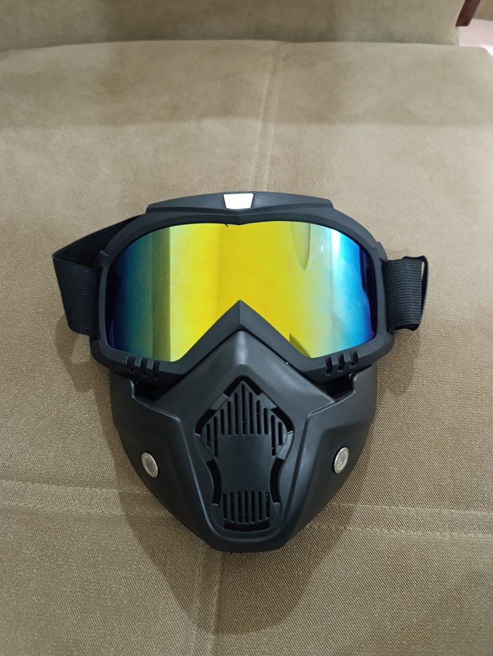 Kemerli tasarıma sahip siyah motosiklet kaskı, kamuflaj desenli ve yansıtıcı gözlüklerle grunge punk tarzını yansıtır.