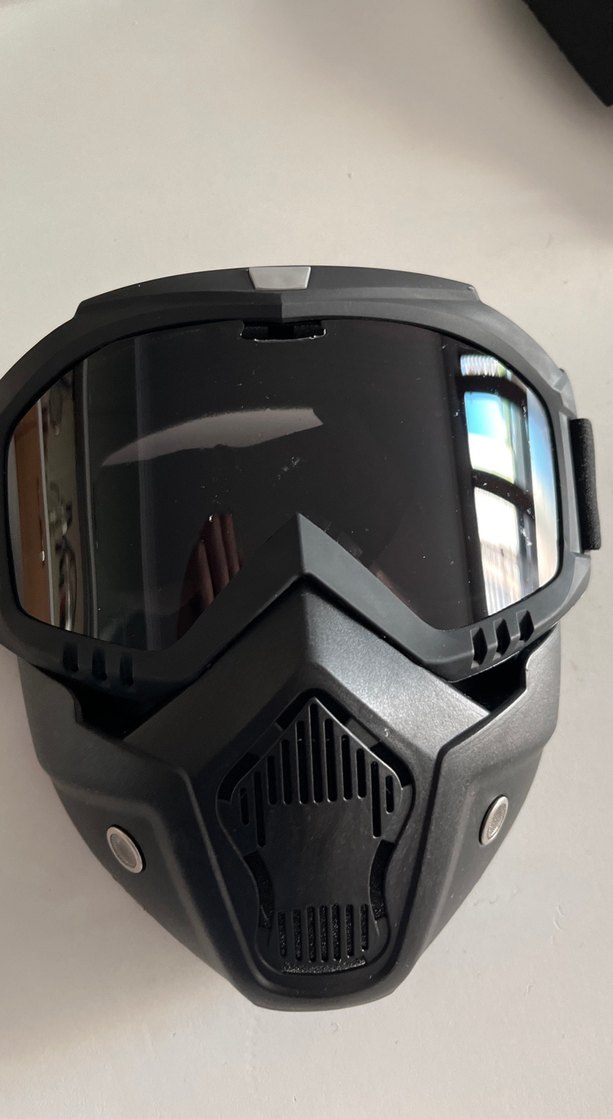 Kamuflaj desenli, kemerli siyah motosiklet kaskı. Plastik malzemeden, koyu renk vizörlü, biker ve rock punk tarzına uygun. ️