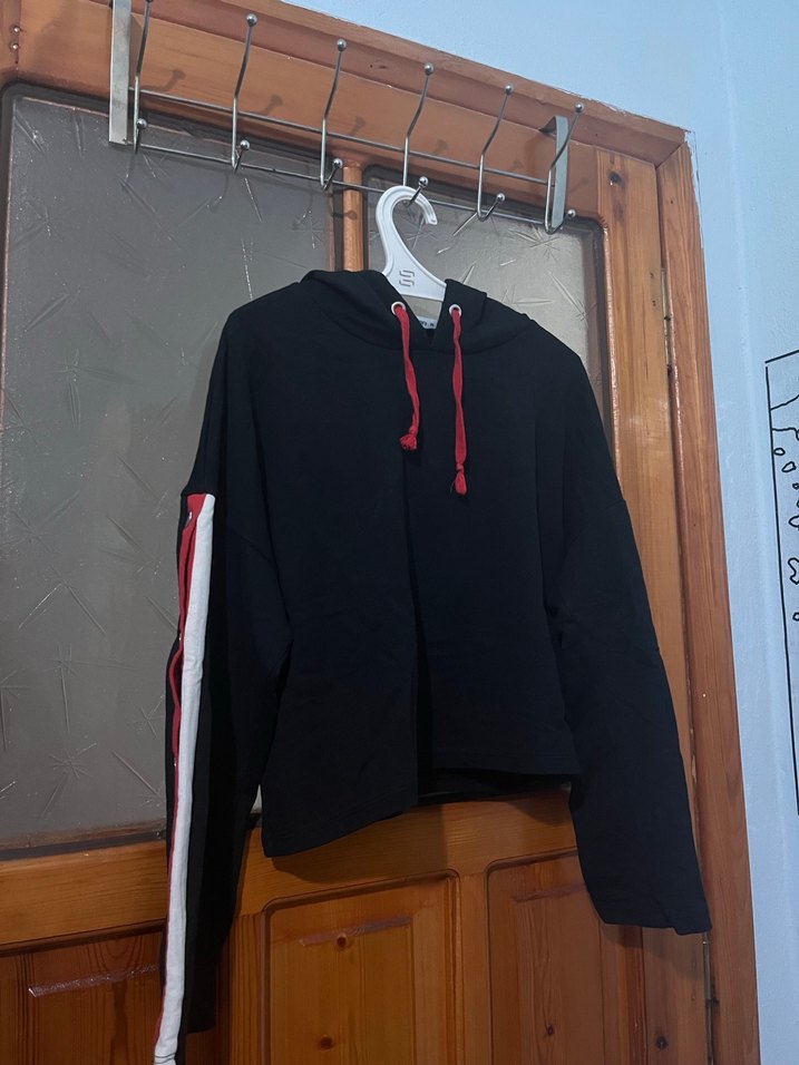 Kemerli siyah kapüşonlu sweatshirt, uzun kollu, beyaz ve kırmızı şerit detaylı, bol kesim ve baskılıdır. Günlük kullanım için uygundur.