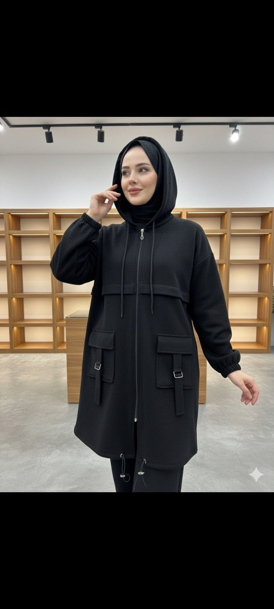 Kemerli, kapüşonlu ve uzun kollu siyah eşofman üstü, bol ve uzun kesimiyle modest bir tarz sunar. Etnik detaylar ve yumuşak, sıcak kumaş kullanılmıştır.