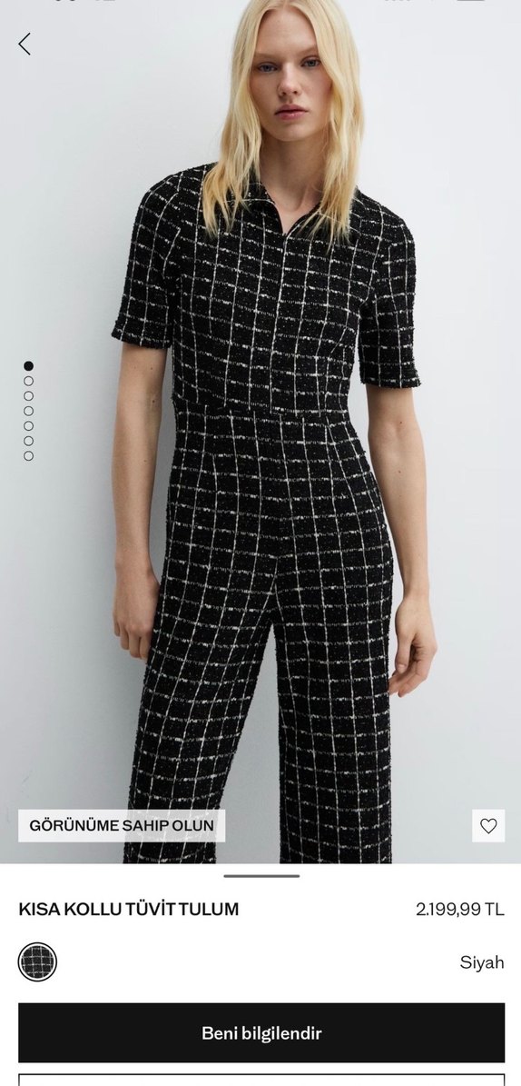 Siyah kareli tulumu, V yaka ve askılı kollara sahiptir. Kemerli bel ve midi boy, ofis için uygundur.