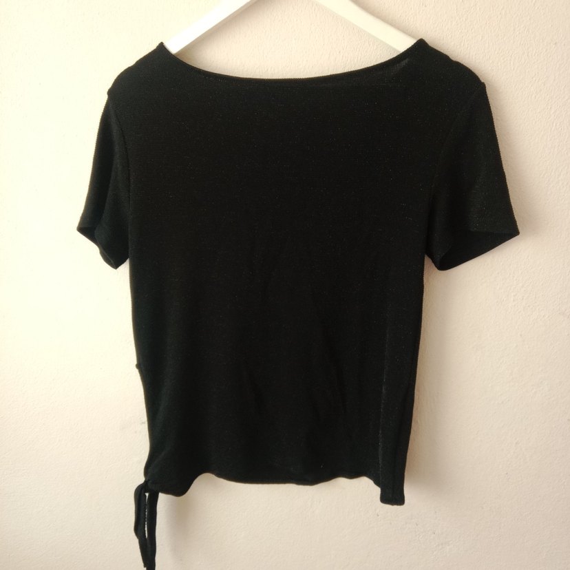 Kemer detaylı, kısa kollu siyah keten kadın tişörtü. Salaş kesim ve midi boyda, günlük sokak stili için uygundur.