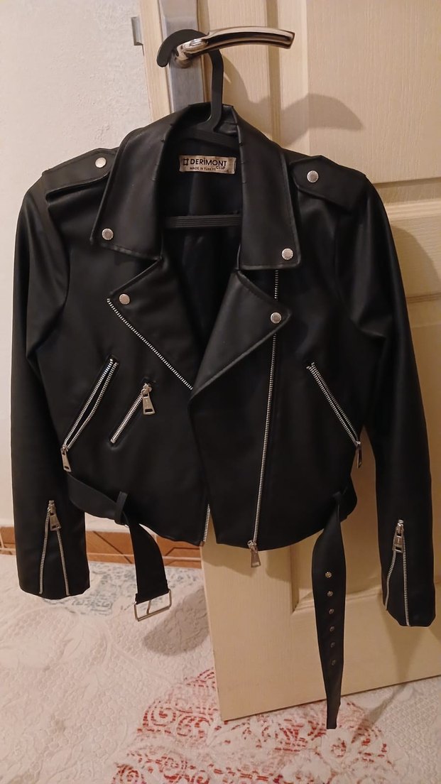 Kemerli, kısa kesim siyah deri biker ceket, keskin yaka ve kayışlı kollara sahip. Gotik rock punk tarzını yansıtan, fermuarlı cepler ve metal düğme detayları içerir. YAKA KISMINDA DEFORMESİ VARDIR LAKİN SİZİ RAHATSIZ ETMEZ, CEKETİN DİGER HER YERİ TEMİZDİR. ☺️
