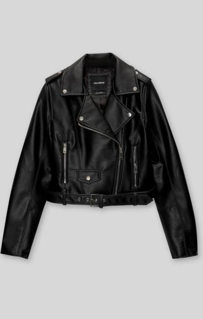 Kemerli, siyah deri biker ceket, keskin yakalı ve uzun kollu. Kısa boyuyla rock punk stilini yansıtıyor. Günlük kullanıma uygun.