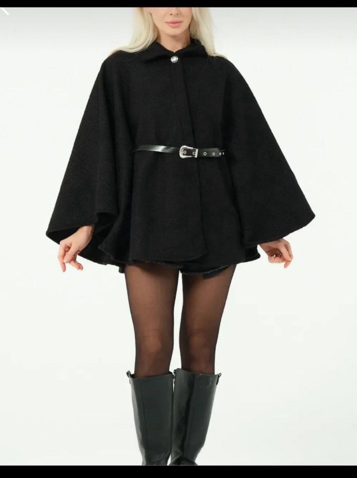 Yüksek yakalı, kayış detaylı, kemerli siyah kısa goth panço. Bol kesimli, yumuşak ve sıcak kumaştan, günlük kullanım için uygundur.