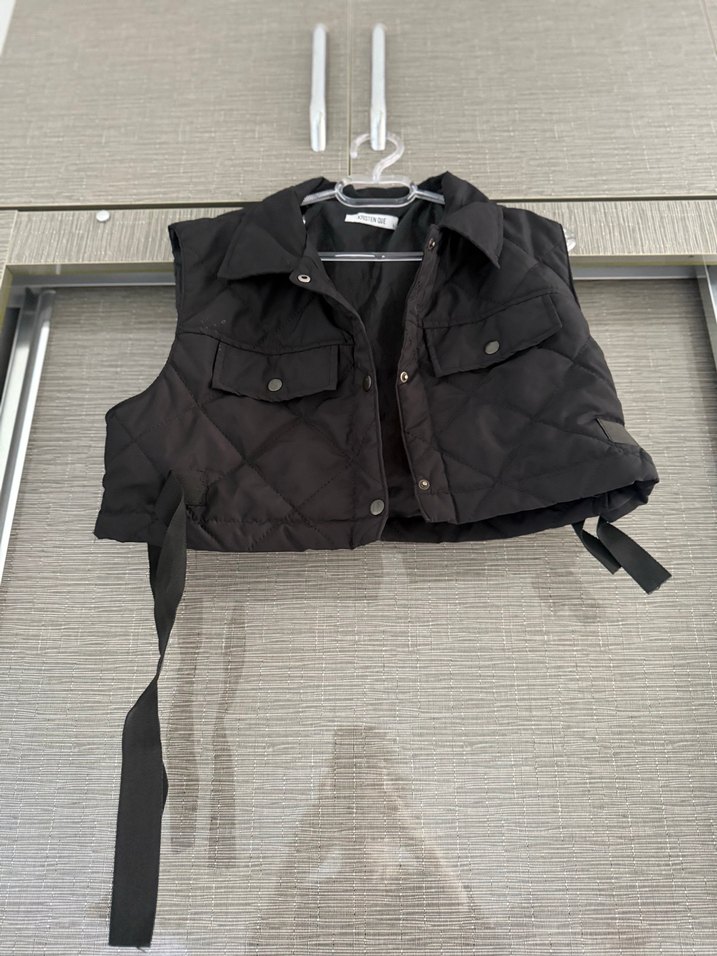 Siyah, kemerli, kısa kesim ve yakalı kolsuz kadın yeleği. Sentetik kumaştan, sokak stiline uygun dar kesim.