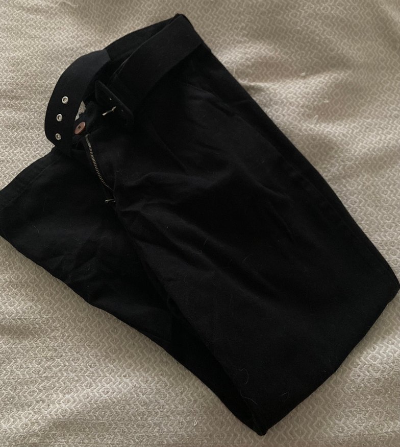 Kemerli, bol kesim siyah kumaş pantolon, minimalist gotik tarzıyla günlük kullanıma uygundur.