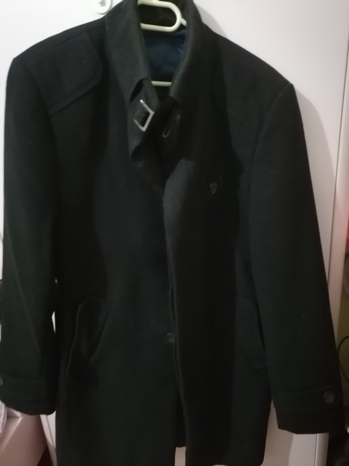 Siyah, kemerli, normal uzunlukta erkek kaban, kesik yaka ve askılı kollara sahiptir. Ofis ve sokak stiline uygun, rahat kesim ve yumuşak kumaş içerir.