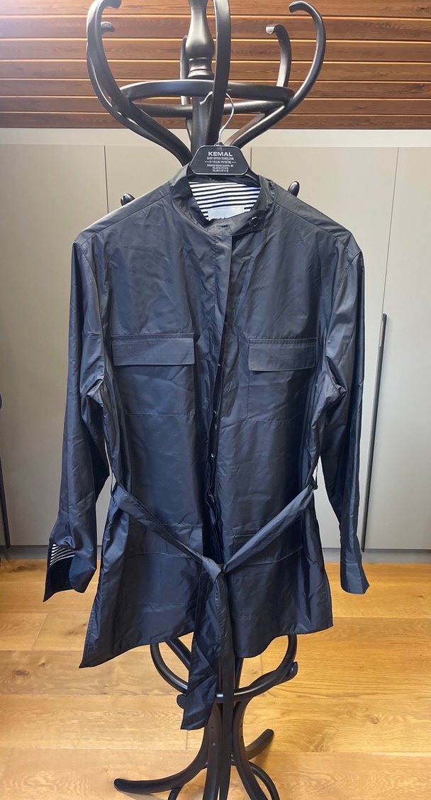 Bu siyah yağmurluk, kemerli bel, yüksek yakalı ve uzun kolludur. Sentetik kumaştan üretilmiş, normal kesim ve midi boydadır, ofis kullanımı için uygundur.