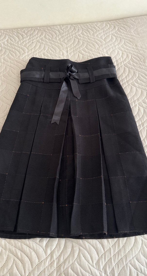 Kemerli bel ve normal kesime sahip siyah midi etek Gotik tarzı ve Paris etkisiyle ofis kullanımı için uygundur.