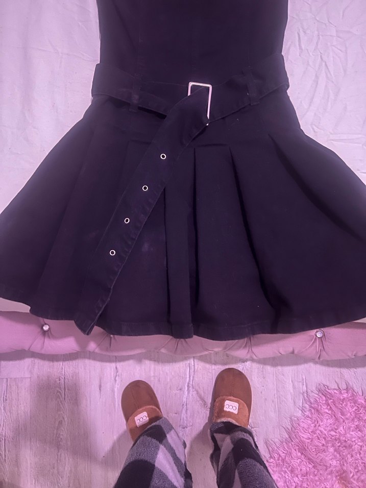 Kemerli, siyah midi mini etek, düz ve vücuda oturan kesimle, sentetik kumaştan. Gotik ve avangart tarzlar için uygun, günlük kullanıma uygun.