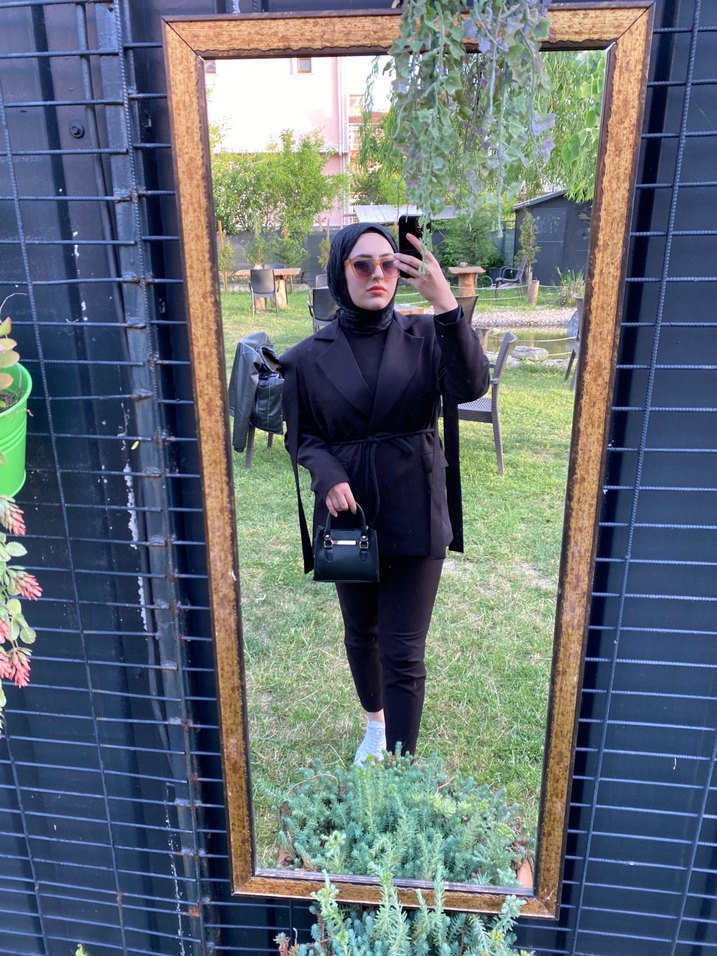 Uzun kollu, kemerli ve kesik yaka detaylı siyah midi blazer. Düz, sentetik kumaştan, günlük sokak stiline uygun rahat kesim.