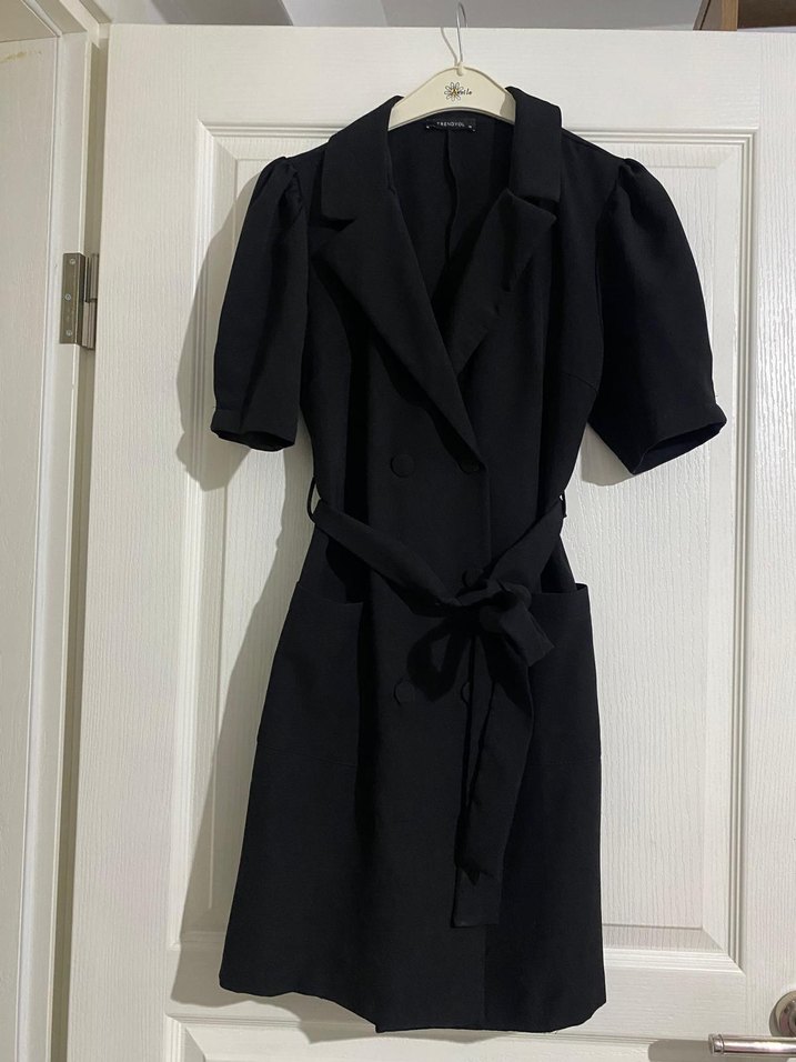 Notlu yaka ve askılı kolları olan siyah midi uzunlukta kadın ceketi. Kemerli bel ile klasik ve rahat bir uyum sağlar.