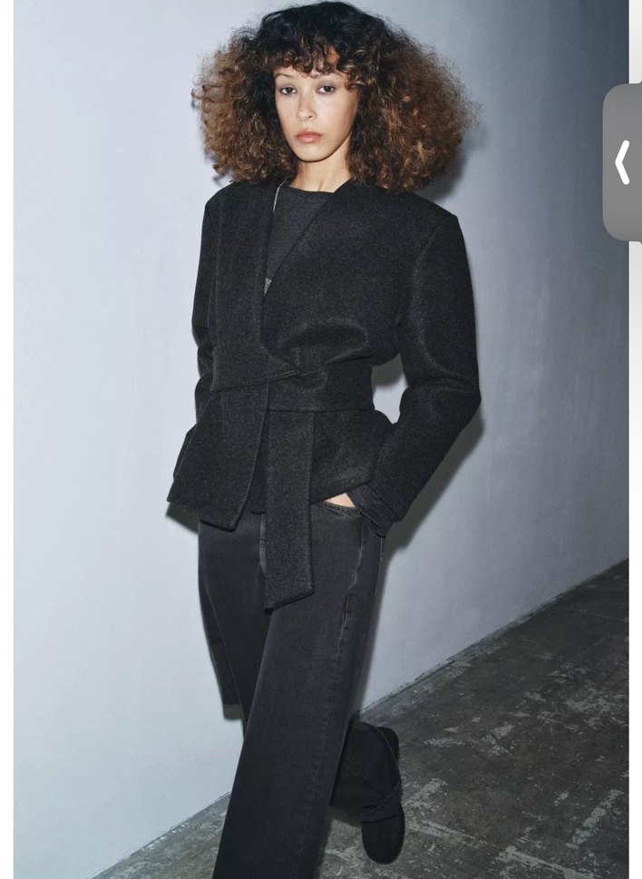 Kemerli, siyah midi uzunluğunda denim blazer. Notlu yaka ve uzun kollu, normal kesim ile ofis kullanımı için uygun, desensiz ve koyu renkte.