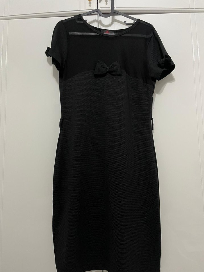 Kemerli, kısa kollu, bisiklet yaka siyah midi elbise. Minimalist ve gotik tarzı ofis ortamına uygun şekilde birleştirir.