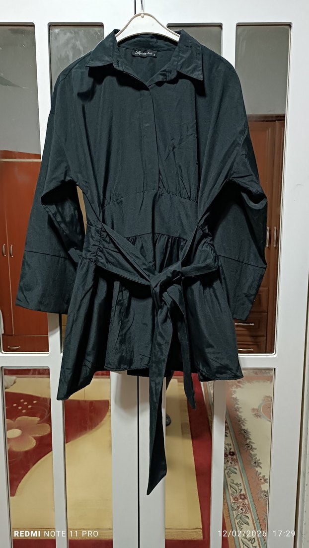Kemerli, uzun kollu, notalı yaka detaylı siyah midi kadın gömlek. Sentetik kumaştan, bol kesim ve ofis kullanımı için uygun.
