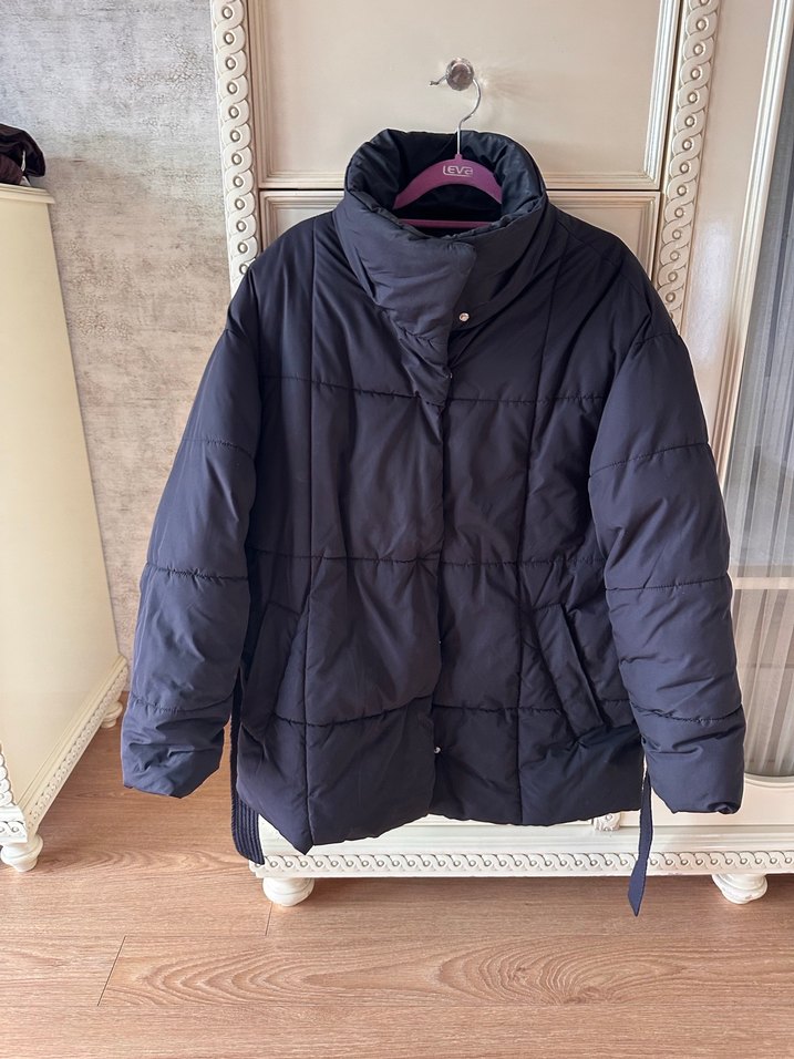 Yumuşak fleece kumaştan, kemerli ve yüksek yakalı siyah kış montu. Gevşek, rahat kesimiyle midi boyda, dış mekan kullanımı için uygundur. Strappy kolludur.