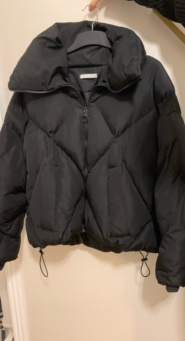 Yüksek yakalı, kemerli siyah kışlık mont. Sentetik kumaştan, fitted kesim ve strappy kollu, günlük kullanıma uygun rahat bir sokak stili mont.