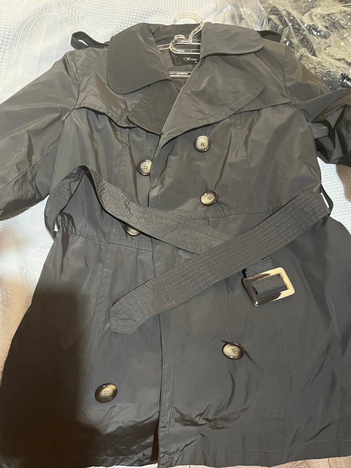 Sentetik kumaştan yapılmış, kemerli ve kesimli siyah midi trençkot. Notlu yakası ve askılı kolları ile günlük sokak stiline uygun.