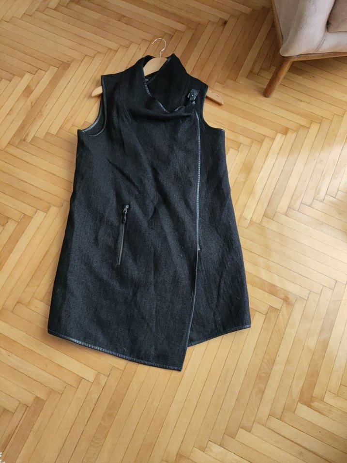 Kolsuz siyah midi yelek, yüksek yakalı ve kemerli. Yumuşak ve sıcak kumaştan, regular fit ve asimetrik fermuarlı.