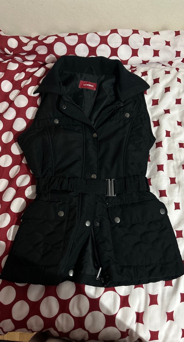 Kemerli, kolsuz, siyah midi yelek. Notlu yaka ve sentetik kumaştan, dar kesimle sokak stili ve günlük kullanım için uygundur.