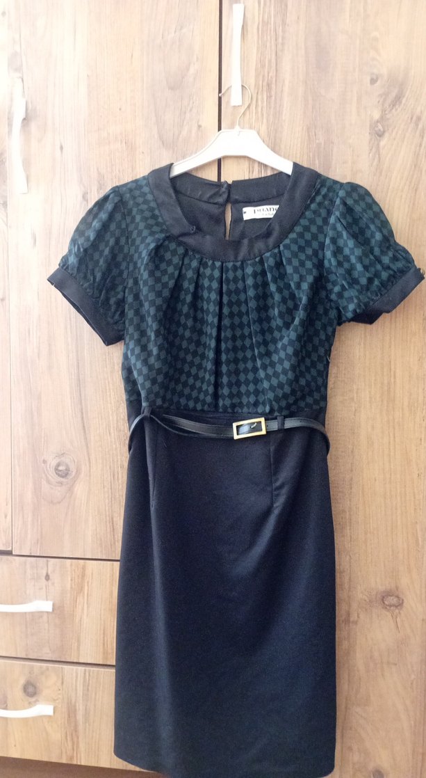 Siyah, kemerli, midi kalem elbise; yuvarlak yaka, kısa kollu ve sentetik kumaşlıdır. İş ortamı için uygun, modaya uygun gotik tarzda bir tasarımdır.