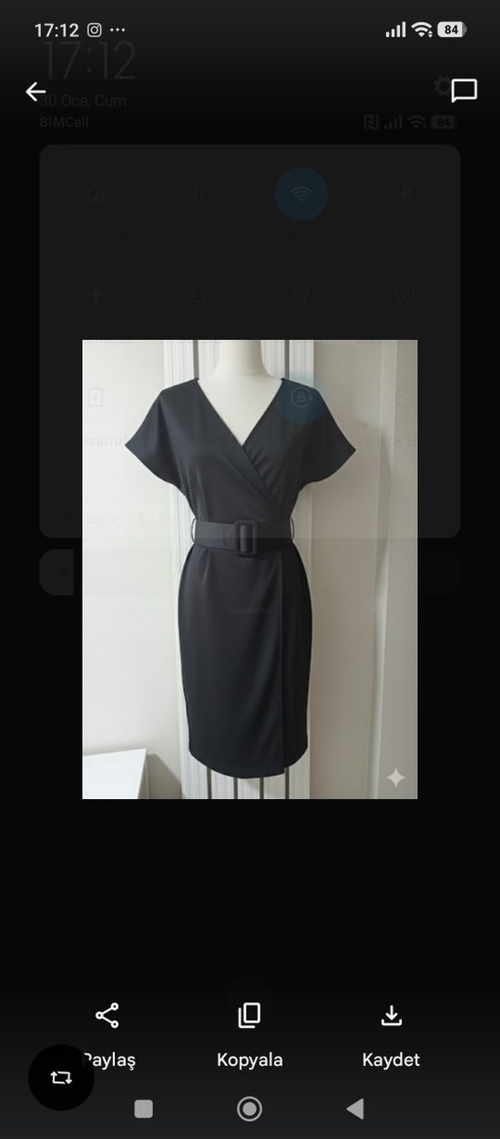 Kemer detaylı, V yakalı ve kısa kollu siyah midi elbise, klasik ve çağdaş ofis şıklığı sunar.