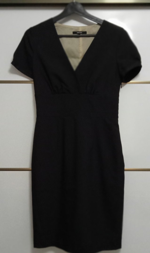 Kemer detaylı, V yakalı ve kısa kollu siyah midi elbise, modern klasik ofis tarzı için uygun, şık ve zarif bir seçimdir.