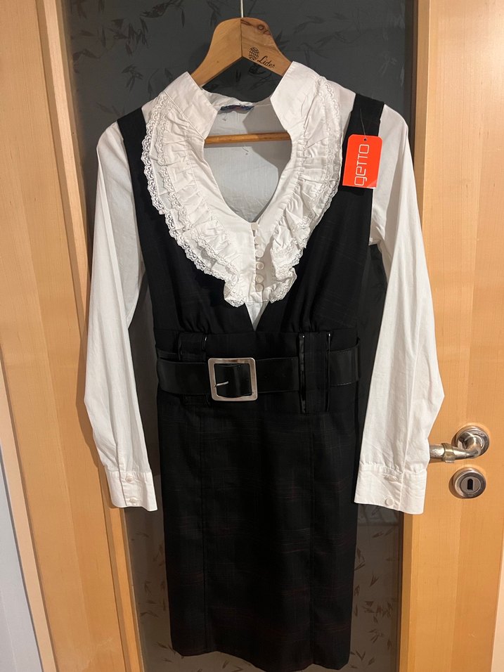 Kemerli, beyaz fırfırlı yakalı siyah midi elbise, ofis için uygun, sentetik kumaştan, kollu ve dar kesimdir.