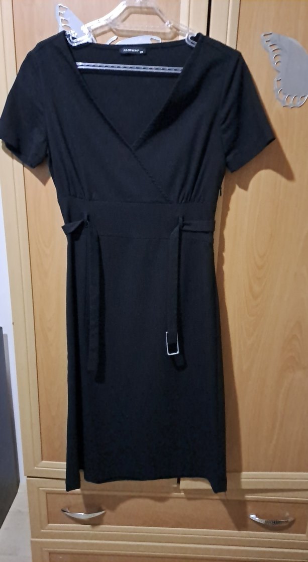Kemerli, V yaka ve kısa kollu siyah midi elbise, klasik ve zarif bir ofis şıklığı sunar. etiketinde 38 yaziyor ancak yaklasik 34 beden iken terzide daralttirdim. o yuzden 34-36 beden arasi kisilere uygun olacaktir.