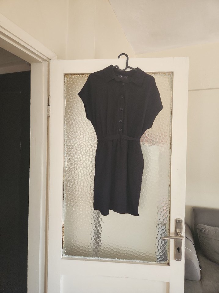 Kemerli, yakalı ve kısa kollu siyah triko elbise, minimalist gotik tarzıyla günlük kullanıma uygundur.