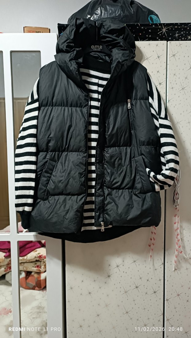 Kemerli, yüksek yakalı, siyah renkli, yumuşak ve sıcak kumaştan yapılmış, zebra desenli, kolsuz, günlük rahat kullanım için uygun dar kesim yelek.