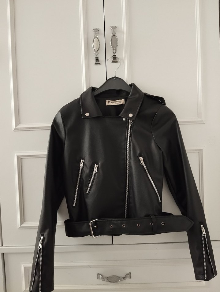 Kemerli, kısa kesim, siyah deri biker ceket. Notlu yaka ve askılı kollarıyla trendy casual tarzda şık bir parça.