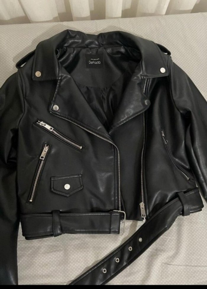 Kemerli, kısa kesim siyah deri biker ceket, keskin yakası ve askılı kollarıyla grunge punk tarzını yansıtıyor. S - M beden uyumludur hiç bir dökülme deformesi yok
