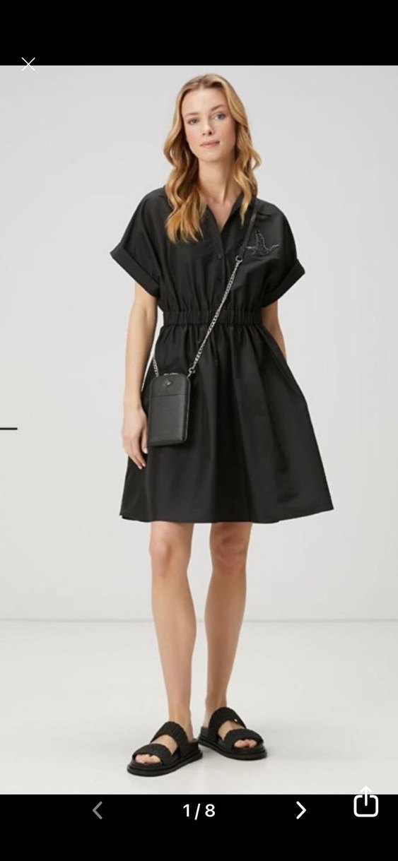 Parlak siyah sentetik kumaştan, kısa kollu ve V yakalı mini elbise. Nakış detaylı ve kemerli, bol kesimiyle günlük kullanıma uygun. İki kol 54 cm boy 93 cm