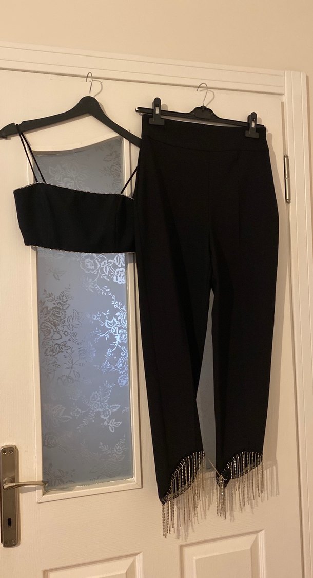 siyah sentetik kumaş pantolon. Regular fit ve kısa boy, püskül detaylı paçalarla ofis ve sokak modasına uygun.Üst 34 alt 38 beden