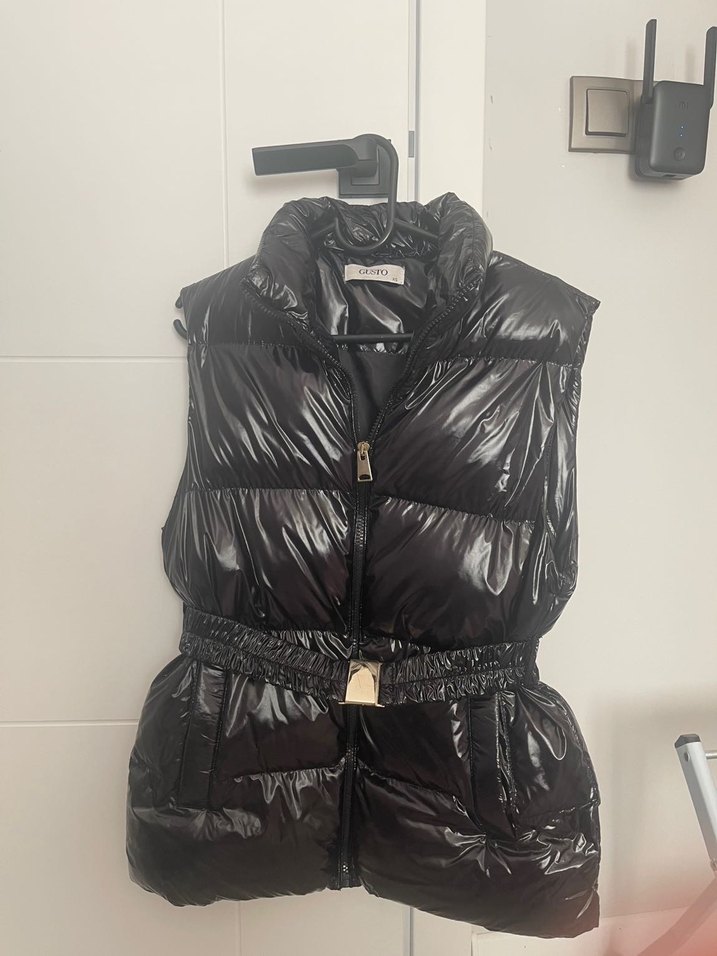 Kemerli, halter yaka ve , parlak siyah şişme yelek. Sentetik kumaştan üretilmiş, sokak modasına uygun şık bir parça.
