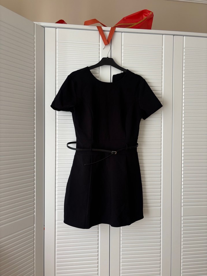 Kemerli, kısa kollu, yuvarlak yakalı, siyah mini elbise, vücuda oturan kesimiyle şık ve gündelik tarz sunar.