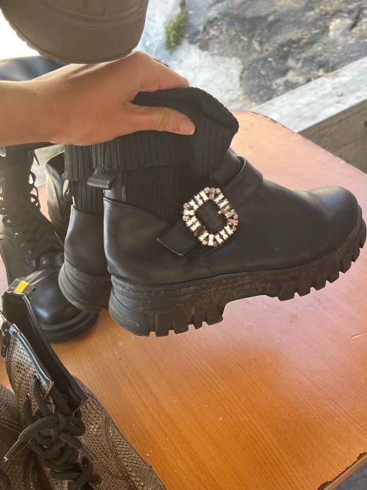 Kemerli detaylı, yılan desenli siyah platform topuklu bot. Kauçuk malzemeden, gotik tarzda günlük kullanıma uygun.
