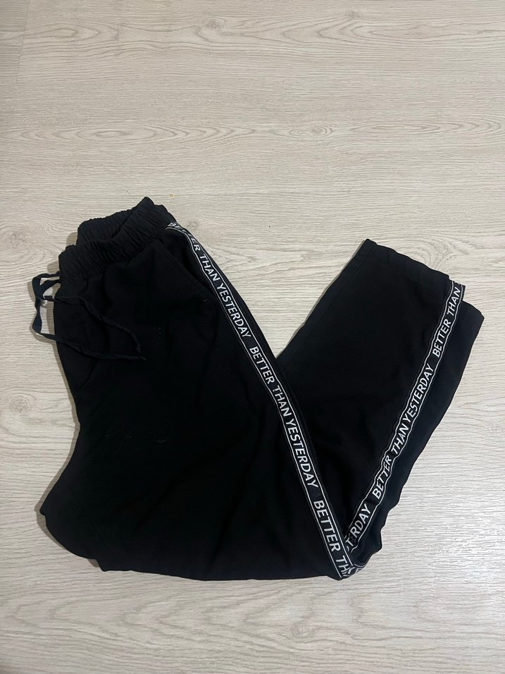 Siyah renkli, kemerli ve yanlarında 'BETTER THAN YESTERDAY' yazılı şeritler bulunan, sentetik kumaştan rahat kesim midi boy kadın eşofman altı.